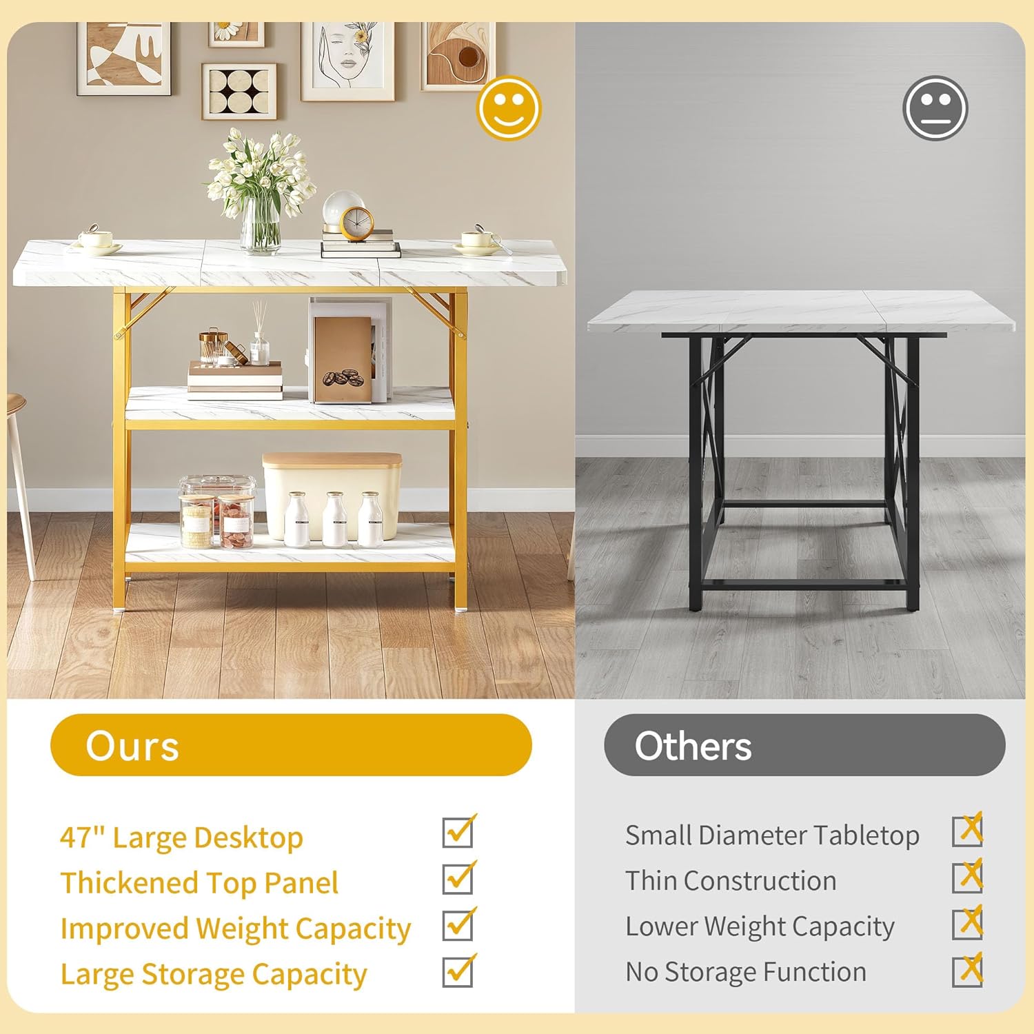 DWVO Dining Room Table 47 Inch Rectangle Dining Table for 4 People Modern Kitchen Table White Marble Dinner Table with Storage Shelf and Glod Metal Legs for Home Apartment White and Gold