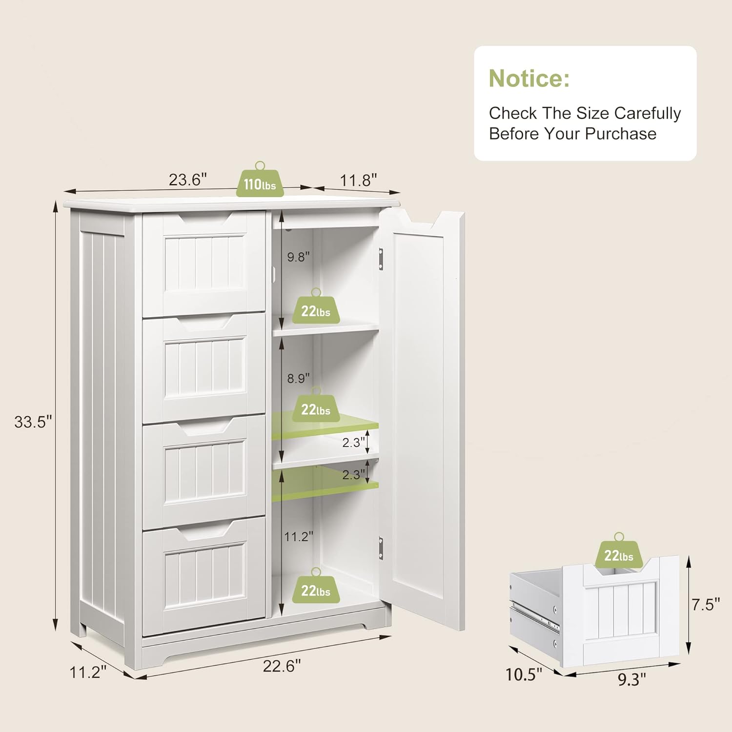 Gizoon 33" Kitchen Pantry Storage Cabinet with Door and Shelves, Small Food Pantry Cabinet Cupboard, Freestanding Wooden Bathroom Storage Cabinet with 4 Drawers for Kitchen and Dining Room, White