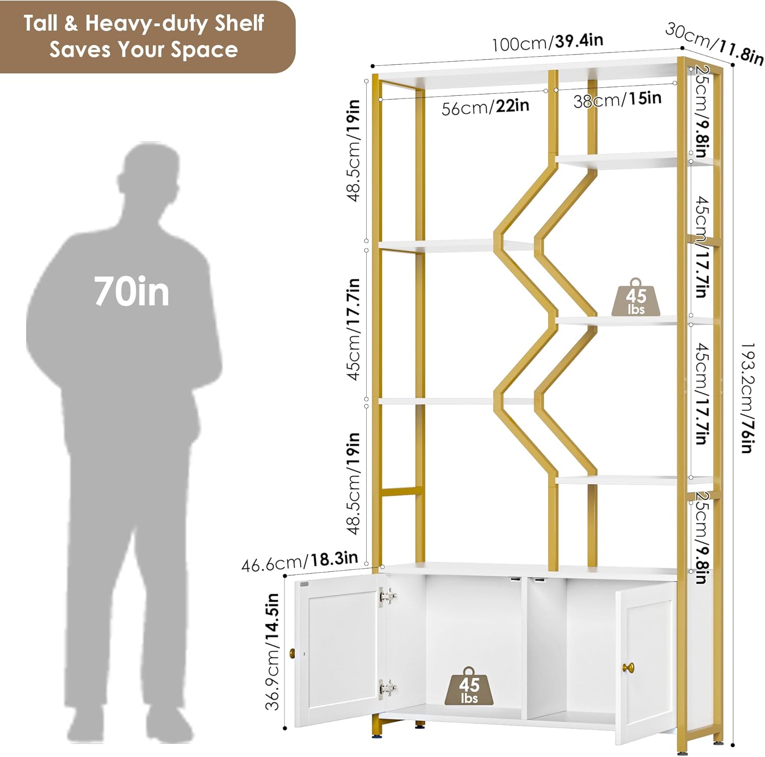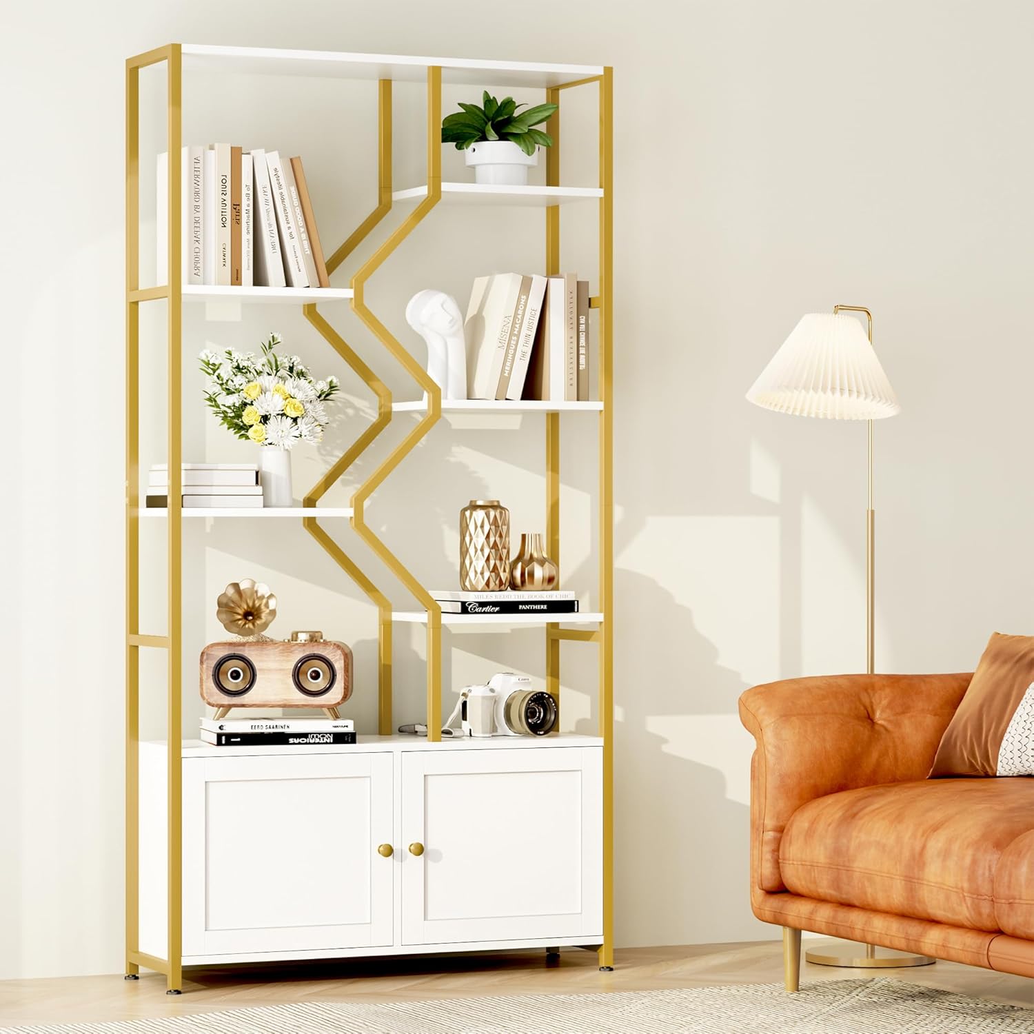 Keyluv 76" Tall Gold Bookshelf with Cabinet Storage, Multifunctional Open Display Bookcase with Door, Large Book Shelf Organizer for Living Room, Home, Office, Heavy Duty Metal & Wood, Modern White